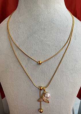 Accents: The pendant is paired with a large, high-lustre white pearl and finished with a dangling gold bead drop, adding movement and elegance to the piece.