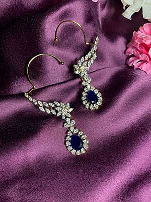 The design culminates in a majestic teardrop-shaped centerpiece, surrounded by a brilliant halo of smaller stones. Available in a variety of rich jewel tones—including Royal Blue, Ruby Red, Classic Black, and Soft Rose—these pieces offer a regal touch to any ensemble. The secure wrap-around hook ensures they stay in place comfortably, making them the perfect statement accessory for weddings, receptions, or high-fashion festive events.